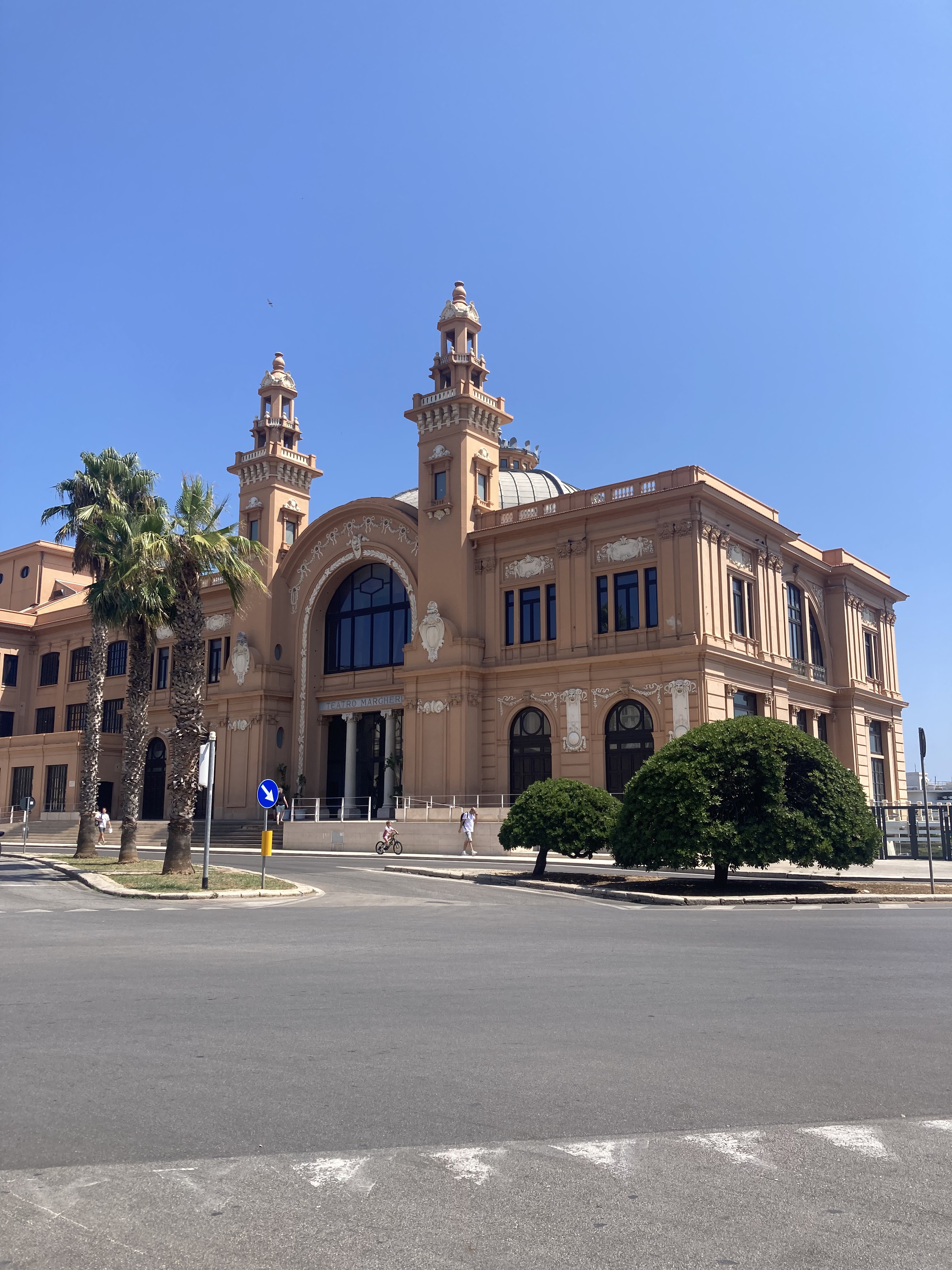 Le théâtre Marguerite, sur le port. Et si, à l’intérieur, le mur du fond de scène laissait place à la mer ?… Nous ne le saurons jamais, mais cette simple hypothèse assortie de la jolie couleur orangeade de la façade suffit à se souvenir du théâtre bâti sur pilotis.