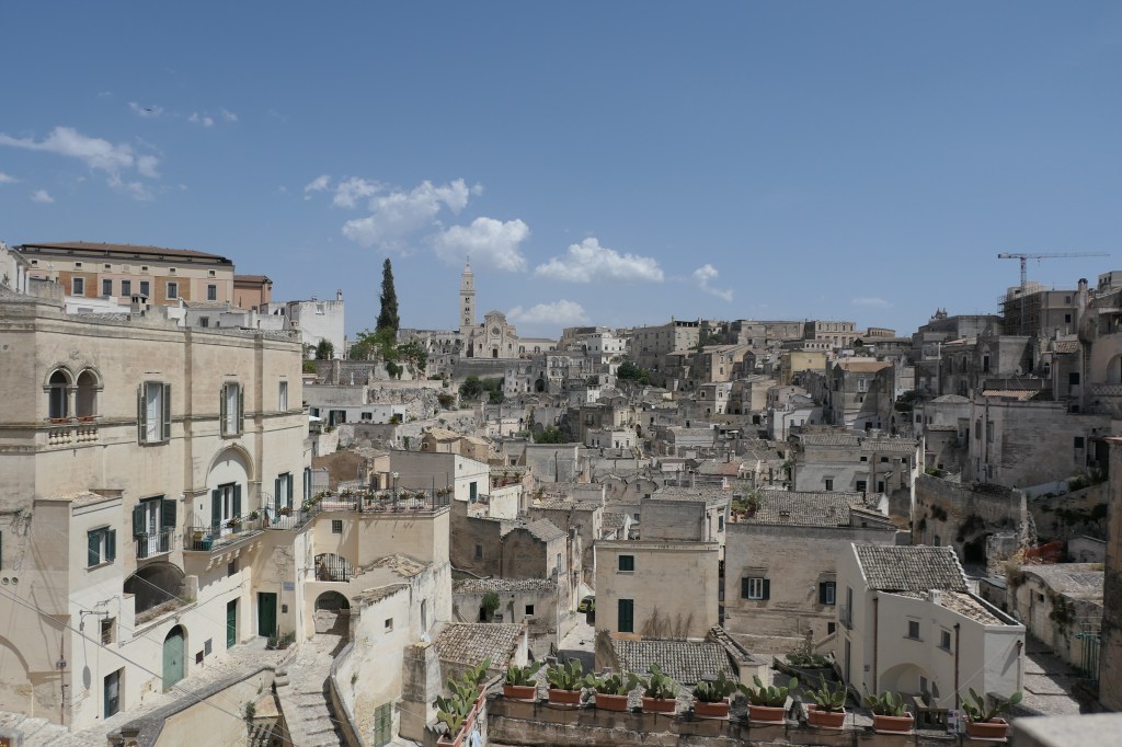 Que dire de Matera… Il est 13h lorsqu’on émerge de la superbe gare moderne. Les rues sont vides. Le soleil cogne. Personne, le silence, des fleurs aux althéas. Au détour d’une rue, la vue, soudaine. Le regard arpente, extatique, les ruelles qui montent et descendent à l’infini. Les toits des maisons (sassi) servent de trottoir à l’étage supérieur. Nous avons quitté les Pouilles pour la Basilicate, plus secrète. Après Alep et Jéricho, Matera est le plus ancien témoignage des villes d’autrefois, murée dans l’obscurité des collines. Les façades décrépies portent encore les stigmates du passé, quand la misère condamnait les habitants dès leur naissance, avant la venue d’un écrivain, Carlo Levi, puis la levée de boucliers de l’UNESCO et le G20… Au fond du ravin, chante une rivière. Là-haut, une église incrustée dans la pierre comme un rapace attentif. Bienvenue à Matera, la ville où le temps s’est arrêté.